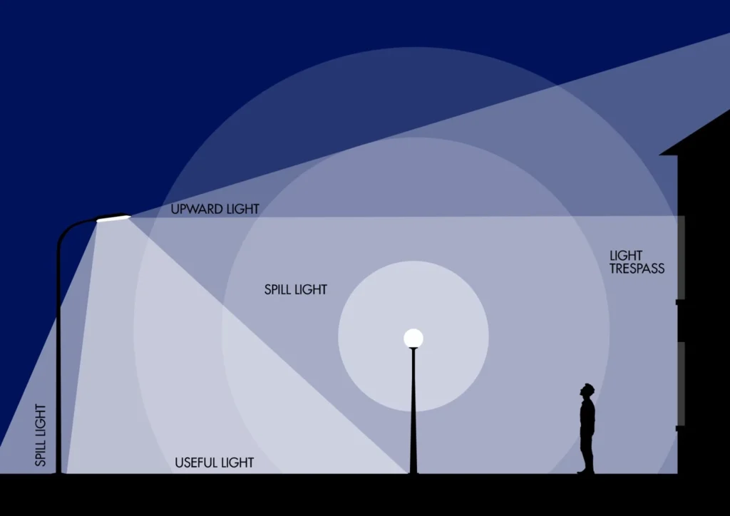 It is commonly classified into four types: glare, which causes visual discomfort; skyglow, the orange or white haze over towns and cities that reflects wasted energy and increased CO₂ emissions; obtrusive light, where light spills into areas it is not needed, such as neighbouring properties; and clutter, caused by poorly planned, overly bright or competing light sources.